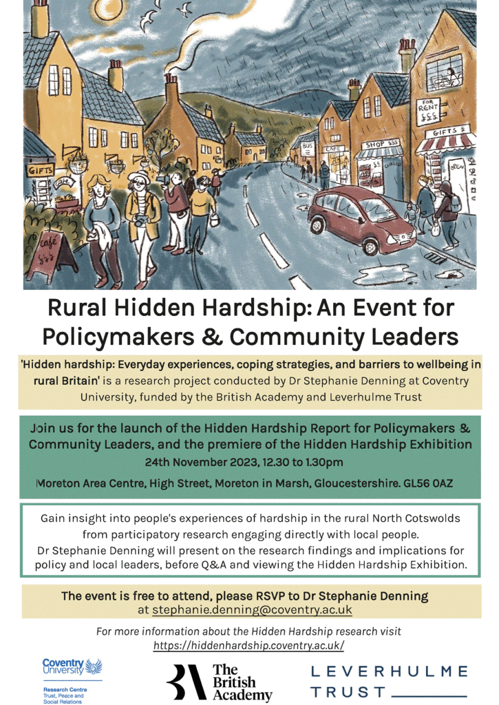 Next steps & resources Project outputs A report for national and local policymakers and community leaders on the research findings and recommendations on rural hardship. A briefing for national and local policymakers and community leaders on the research findings on rural hardship. An exhibition on hidden hardship working with the artist Beth Waters who illustrated research participants’ experiences. See below to visit the exhibition in Coventry Cathedral January-February 2024. An accessible summary of the key findings of the research. A short illustrated book, published on this website, of people’s experiences of rural hardship. Details to follow in early 2024. In September 2023 Stephanie presented the initial research findings at the Royal Geographical Society Annual International Conference.Further papers will be published in 2024 on people’s lived experience and coping strategies of rural hardship. Further academic papers will be published in 2024 on people’s lived experience and coping strategies of rural hardship. Project events