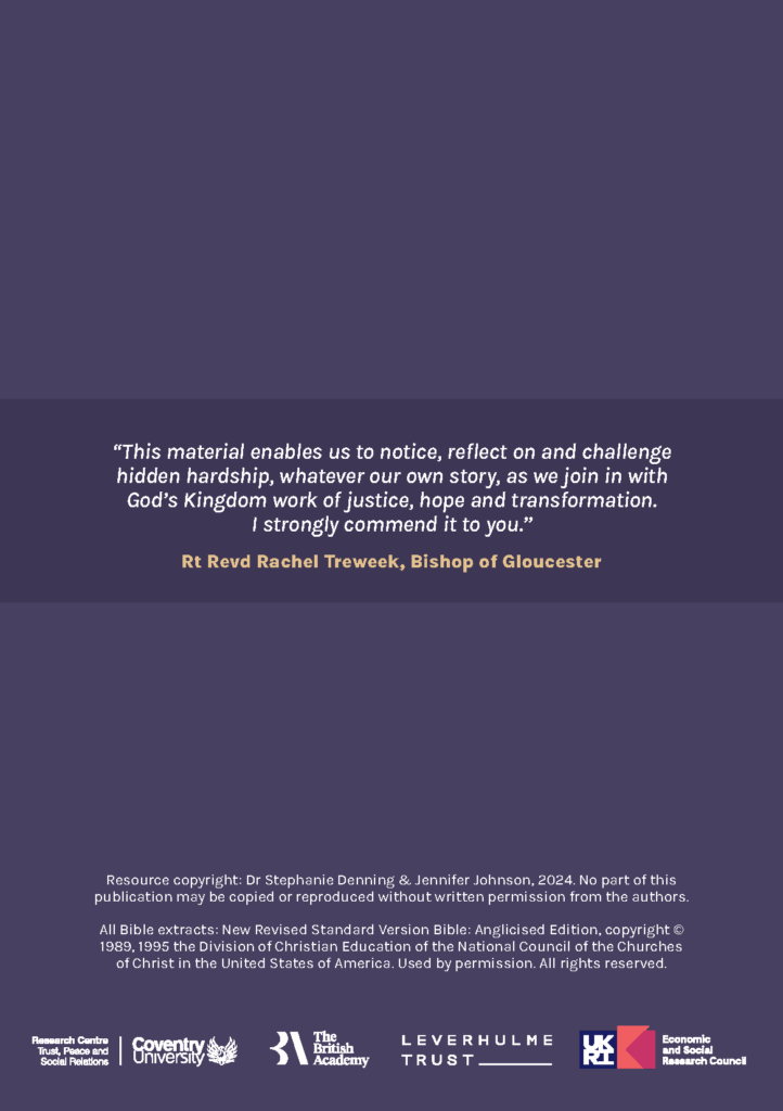 The guide has 10 themed days for you to engage with and is written for individuals rather than groups to do together. Days 9 and 10 conclude with themes on taking action. We have aimed to be both affirming of current responses to hardship, and to challenge individuals, congregations, and groups on how we can work for a future without hardship.